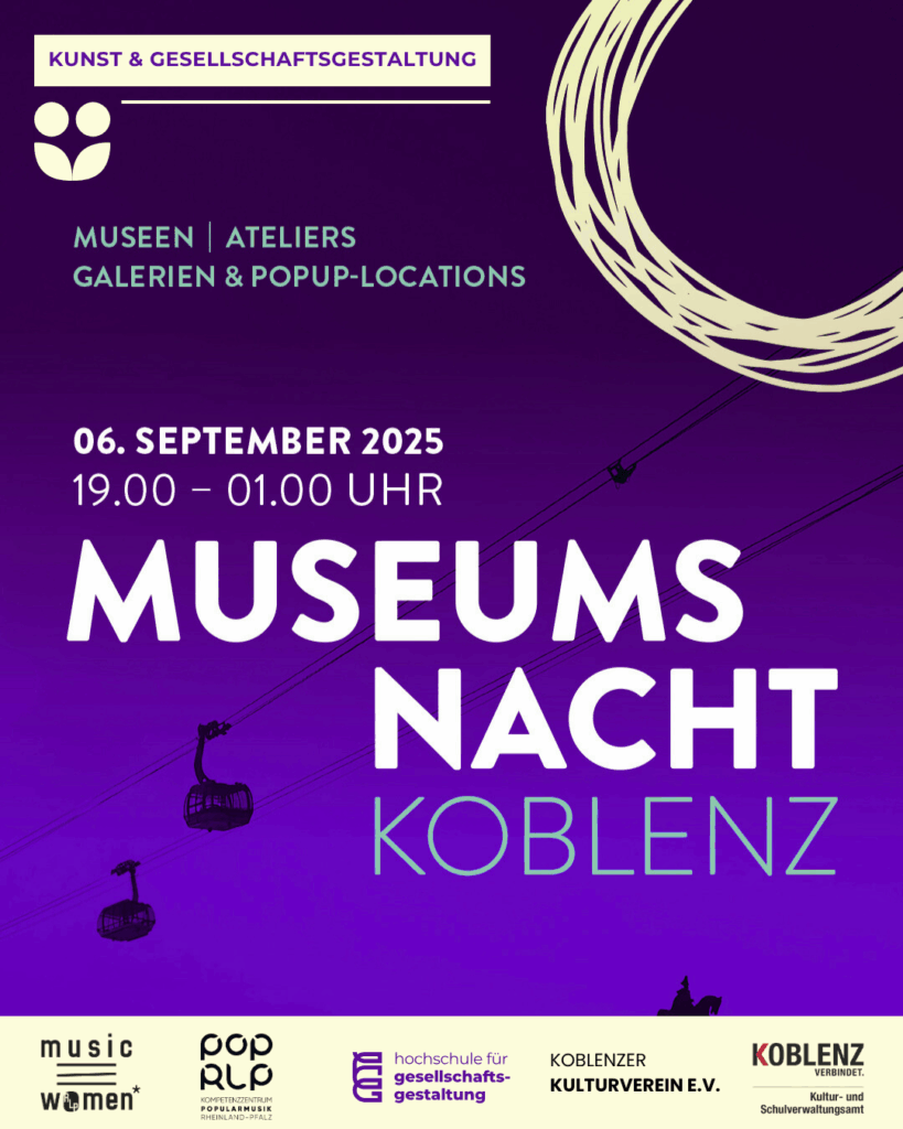 Am 6. September 2025 stelle ich im Rahmen der Museumsnacht Koblenz in den Räumen der Hochschule für Gesellschaftsgestaltung aus. Los geht’s um 19 Uhr in der Kornpfortstr. 15 in Koblenz. Weitere Infos zu allen Aussteller*innen und dem Begleitprogramm findest du hier: https://hfgg.de/events/event/museumsnacht-koblenz-2025/